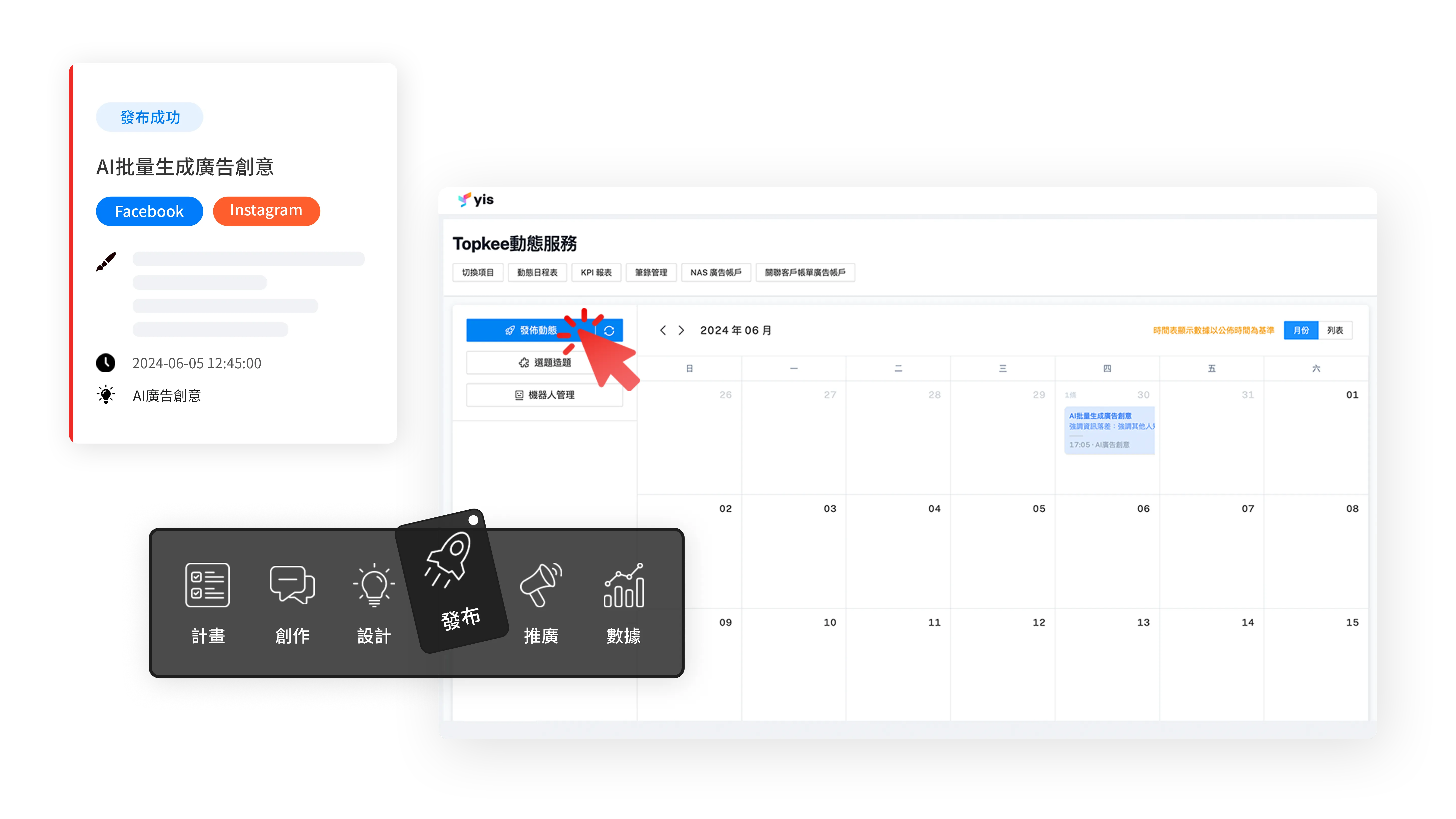 一款功能強大的社交內容管理工具,無縫集成多個社交媒體和廣告,在極大地提升工作效率的同時,持續創作出有深度的社交內容。從安排計劃、創作內容、設計圖片,到一鍵多渠道發佈、貼文推廣、數據報告分析,YIS全方位助力你輕鬆經營出高水平的社交媒體專頁。